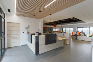 Dans les bureaux, un plafond en laine de roche blanc composé de panneaux 600 x 600 a été posé. Des plafonds identiques, mais de couleur noire, ont été installés dans les zones de circulation et à l’accueil. De plus, Delhoume a installé 51 blocs portes stratifiés.
