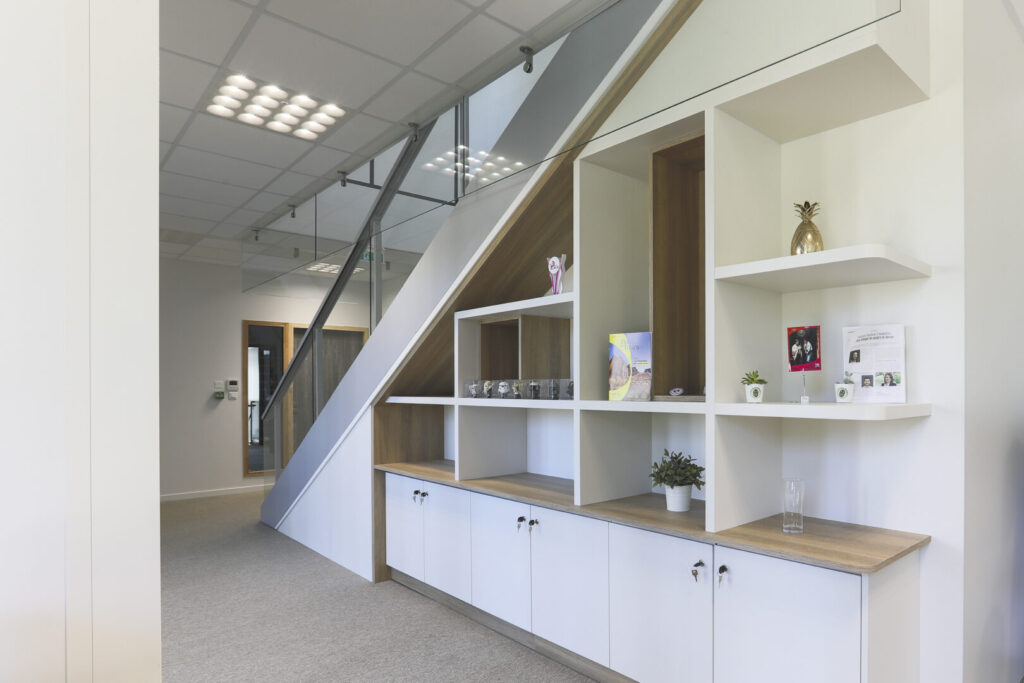Sur la partie agencement, Champigny Segelles a coordonné la fabrication et la pose d’un ensemble de mobiliers sur mesure : banque d’accueil, bibliothèques, rangements, cuisines, claustra et estrades modulables… Réalisé en mélaminé et stratifié, l’ensemble intégrait des éléments acoustiques en PET pour améliorer le confort sonore. Le logo de la CCI figurant dans l’espace d’accueil a été découpé dans du PVC expansé, optimisant la visibilité et ajoutant une touche d’élégance à l’enseigne.