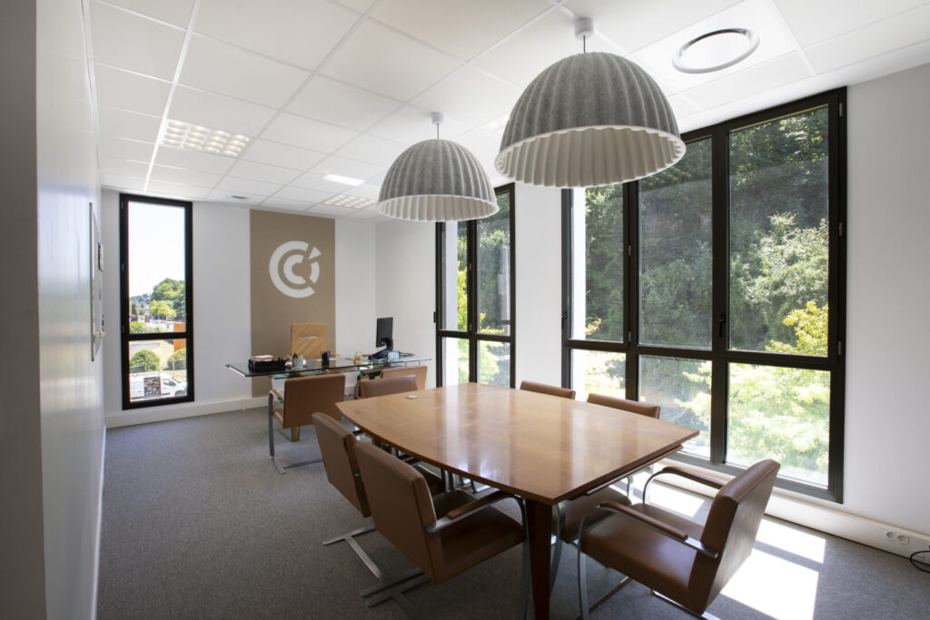 L’objectif des travaux : offrir à ses collaborateurs et visiteurs un lieu moderne, modulable et performant, incarnant son image d’acteur économique majeur. Ce nouveau siège en R+2 sur une surface totale de 2 000 m² visait aussi à affirmer la présence de la CCI Touraine dans un quartier en plein renouvellement urbain, marquant ainsi son dynamisme et son implication dans le développement économique régional. Pour concrétiser ce projet, Champigny Segelles est intervenue sur deux lots : agencement mobilier et acoustique d’une part, cloisons modulaires et plafonds suspendus d’autre part. La fabrication du mobilier a été réalisée à l’atelier Morillon. L’ensemble du chantier, piloté par le cabinet By Optim en qualité de maître d’œuvre, a été réalisé sans interrompre le fonctionnement de la CCI.