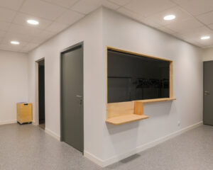 La déconstruction finie, 1200 m² de plafond suspendu en dalle minérale ont été posés, des baffles acoustiques en cube recouvertes d’une housse ont été ajoutées à l’ensemble. Côté menuiserie intérieure, 11 bloc-portes EI30 ont été installés. Pour l’aménagement des vestiaires, des cloisonnements en panneaux stratifiés compacts ont été posés. Des bancs en bois massif et une tablette pour le guichet d’accueil ont été réalisés, ajoutant une touche de raffinement à l’accueil. Une cabine en cloisons modulaires double vitrage avec stores intégrés, dédiée au bureau d’accueil et au poste de commande pour l’éclairage et le système sonore, a été également installée.