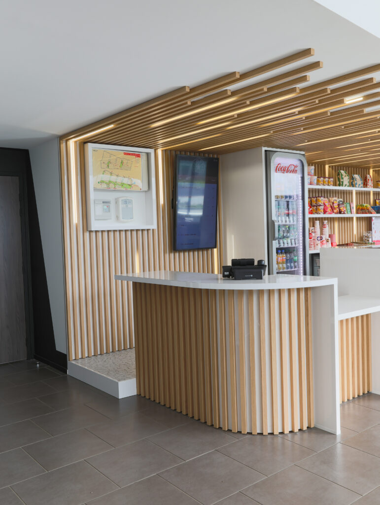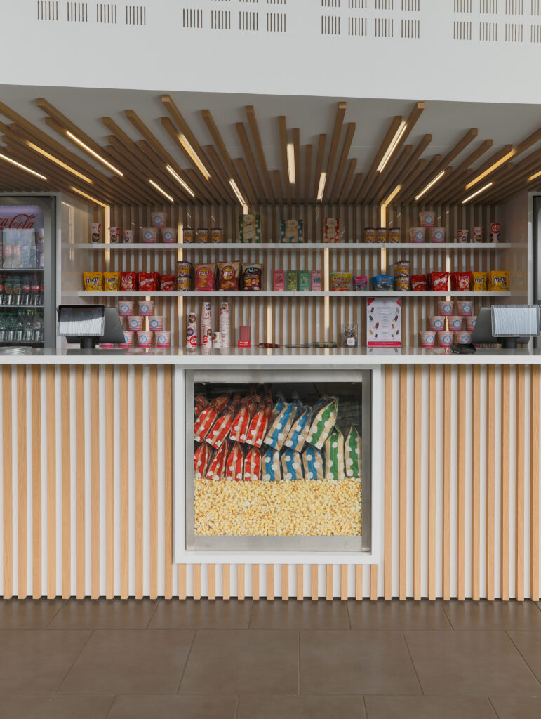 Le comptoir d’accueil, long de 11 mètres, a été fabriqué et installé par Morillon, utilisant du stratifié brillant pour le plan de travail et des finitions en bois pour les murs et plafonds. Des tasseaux aspect bois plaqué ont été installés pour obtenir une harmonie esthétique avec les espaces environnants. La gestion du bar et de l’arrière-bar nécessitant une refonte complète, les équipes Morillon ont effectué la dépose du mobilier existant. Elles ont ensuite créé et posé un bar de style plus urbain, en stratifié blanc et bois pour rappeler l’espace d’accueil. Les compagnons de Delhoume ont installé une toile tendue à froid sur l’ensemble des 180 m², conçue pour lier les différents espaces et abaisser visuellement le plafond, ajoutant ainsi une touche chaleureuse souhaitée par le maître d’ouvrage. Afin de maintenir les luminaires dans la toile tendue, il a été nécessaire de faire un supportage appelé « chaise de luminaire », permettant une fixation mécanique du point d’éclairage. Les travaux ont été réalisés en différentes phases pour permettre au cinéma de rester ouvert tout le temps de la rénovation.